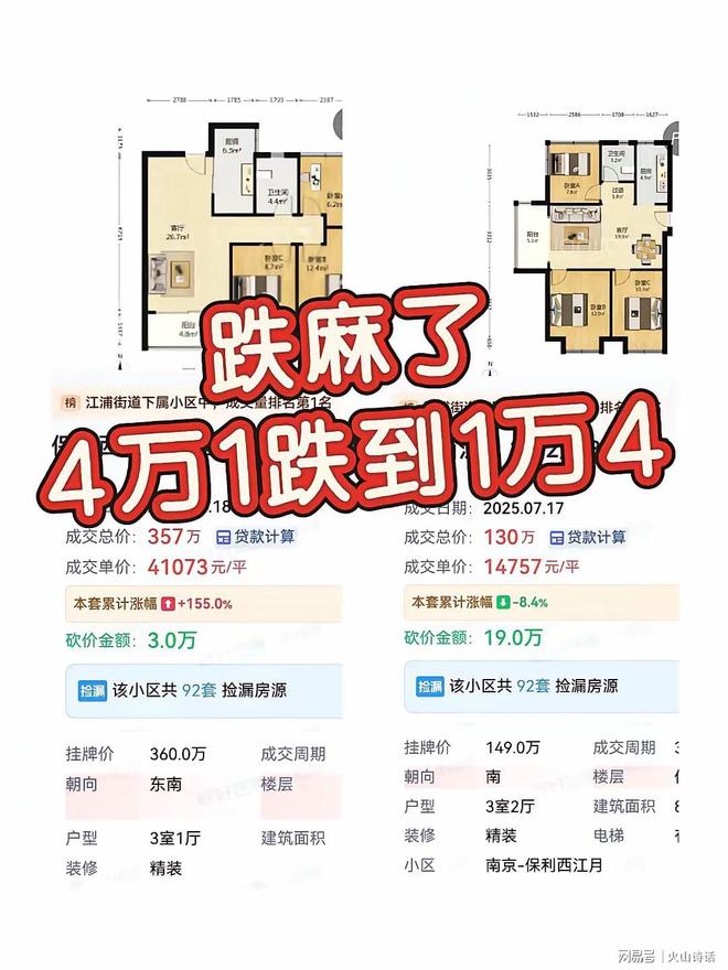 南京保利西江一个月流失227万人,却瘫痪了吗?近日,该消息在网络上引起关注。 2021年购买的南京江北坡里西江月一套86平米三居室售价357万日元,单价4.1万日元。 2025年7月成交价仅为130万,单价1.4万。其市值蒸发了近70%。不幸的是,上面的数据仅针对一个节点。最新数据显示,9月份波利西江下跌。 2025年9月,南京市现有住宅价格环比下降1.05%,同比下降18.8%。 Poli Nishiegaku项目的现房价格比去年下降了27%。保利西江粤二季度交易均价为1.64万元。仅9月份二手房成交均价就跌至12700元。短短几个月,下降速度r均高达23%。多么悲惨啊!要知道,2015年保利西江月刚开业时,均价在1.6万左右。任何购买该项目并且今天尚未出售的人都将完全损失,无论业主是谁。如果从2021年左右4万的高点开始,那就会损失70%。如果再加上另一笔贷款的利息,损失可能会超过80%。这意味着,从这个阶段开始的人可能永远都拿不回自己的钱,即使需要一辈子。对此,有网友评论称,同地区拆迁房屋的单价在7000到8000,和这套房子相差不大。拆迁安置住房设施应优于集体住宅。有网友晒出照片称,每平米已经有1.1笔成交。 1.2 这是过去的事。那么南京现在的房价是多少呢?更令人欣慰的消息是,该物业市场火爆,南京楼市似乎出现复苏迹象。上周数据显示,成屋成交均价1.77万元,环比上涨0.8%。另一组数据来自特定房产的销售价格。河南省南京市二手房成交价最低为每平米2.05万(海峡城),中华屋从9万多暴跌到5万多,华侨城天鹅堡售价3万……我们来看看二手房的价格走势。如果我们观察某些平台过去六个月的走势,总体趋势是小幅下跌,但价格并没有太大波动。目前单价超过23000元。也就是说,目前二手房交易的现状是价格与销量互换。新建住宅走势较为稳定,总单价徘徊在29,000日元左右。必须说的是商品房本身就是一种产品,它的涨跌是由市场供求关系引起的。房子是用来住的,不是用来炒的。上述部分住宅小区的价格状况符合市场经济规律,忠实反映了当前房地产开发的一些情况。价格波动是由市场需求的变化决定的。就算能减少一半,也可能有什么特殊原因。比如开头提到的项目地产cto,我们会详尽分析暴跌的各种原因。 (一)30层以上高层建筑密集,贫民区划分明确。 (2)房屋外观设计与被拆迁房屋无差异。 (3)邻近房屋拆迁价8000元。 (4)配套设施较差,独居人员居住极为不便。总体来看,目前南京楼市n 房价下降或开始复苏的时期。当然,毫无疑问,相比最高价,已经下降了不少。毕竟房子是用来住的,不是用来炒的。这对于需要买房的人来说是一个机会,但买房前一定要考虑家庭的经济状况,尤其是申请贷款的人。我爱买房。毕竟,还款是一项长期工程。您对此有何看法?